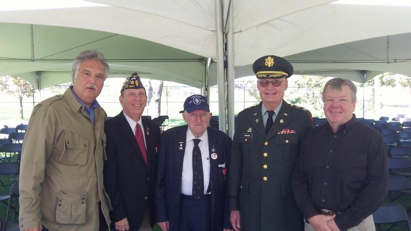 Starting From (L) in green Army fatigue's- Anthony E. La Piana Founder and President of Guardian Corps of America, following are members of the Maywood Bataan Organization, the late Barry Cicero, center - Marine Sgt Major Edwin Walker, (Vietnam), Army Col. Richard McMahon, (Vietnam) and Steve Gibsom, computer specialist for the Maywood Annual Bataan Organization.