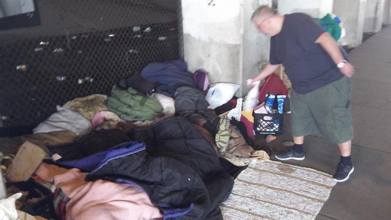 OPERATION EDDA: GCA Area Representative, Mike McCleavy is shown placing a Homeless Person Survival Kit next to a homeless man sleeping under a viaduct at North Avenue- I-90/94 in Chicago, Il.
